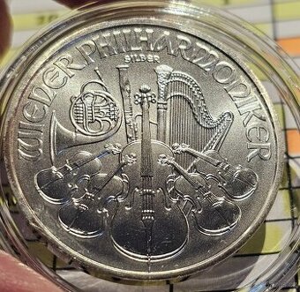 Investiční mince philharmoniker rok 2022. Váha 1oz 31,1g čistého stříbra 999. Minci mám v kapsli. Na jednom kraji je náznak koroze. Cena včetně poštovného.