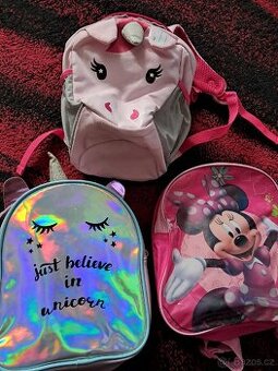 Vhodné pro dívky. 1) Batoh s jednorožec barvy sv. růžová má 2 šedivé boční kapsy na nápoje, uvnitř 1 kapsa na doklady. Materiál nylon. Zapínací popruh pro lepší držení ramenných popruhu, aby dítěti batoh nepadal. Můžu zaslat přes zasilkovnu. 2)Batoh Minnie Mouse růžové varvy. Malý plátěný batůžek s plastovou podšívkou. Vhodné pro děti do 5 let. 3)Světle fialový batoh s jednorožcem s lesklou holografickou přední částí. Nastavitelné rukojeti. Koženka. 4) Kabelka růžové barvy , zapínání na zip. Cena za kus.