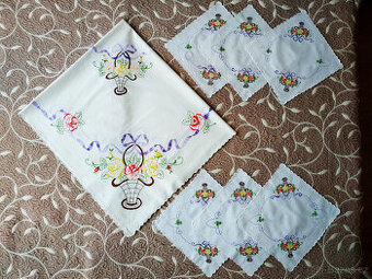Ručně vyšívaná sada - ubrus + 6x dečka - NOVÉ