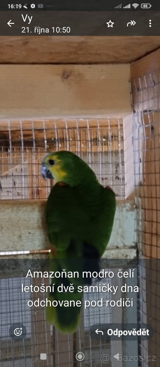 Prodám loňskou samici amazoňana modroceleho, test DNA. Po telefonické domluvě odběr v Jílovém u Děčína. 607 607 722