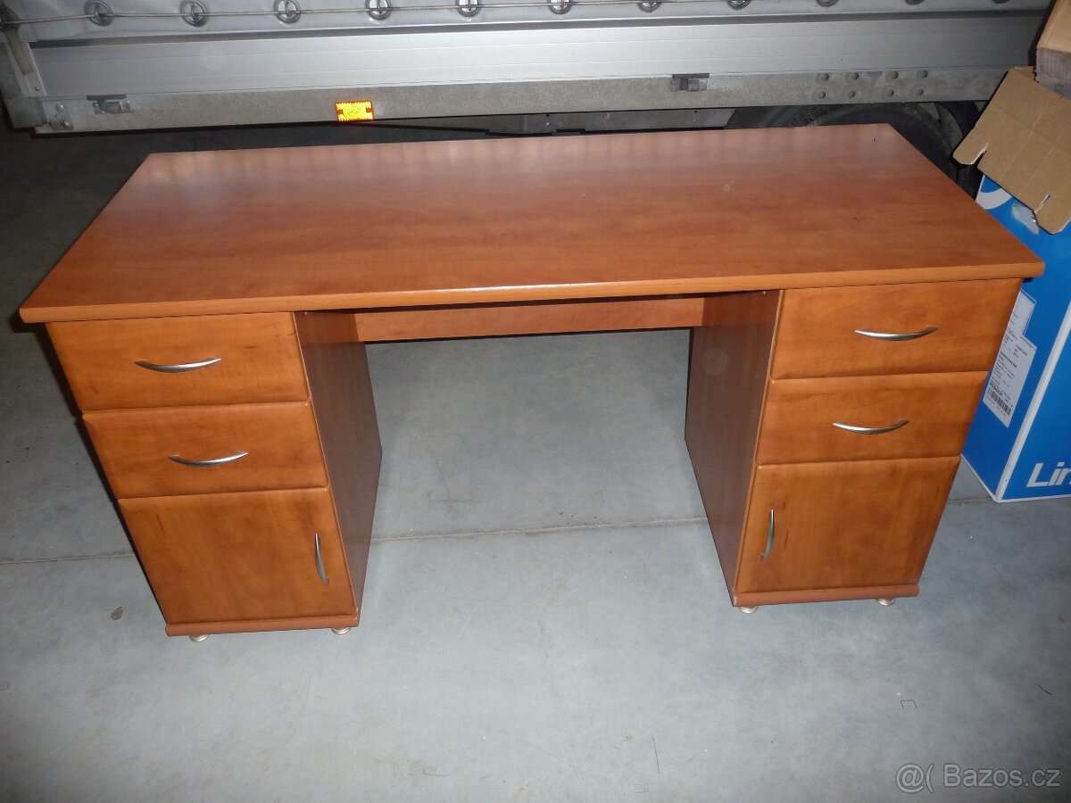 Prodám použitý psací stůl se šuplaty na desce je rýha cca 3cm, spodní část je otlučená od kolečkové židle.
