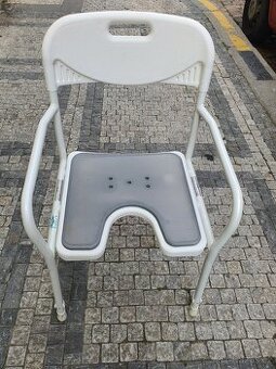 zdravotní pomůcka - odolná židle do sprchy. Židle je lehká , opěrky rukou, opora zad a sedák má navíc měkčené sezení. Výška nohou se dá změnit. Pořizovací cena 1700 Kč, nosnost 120 Kg. Značka Dietz.