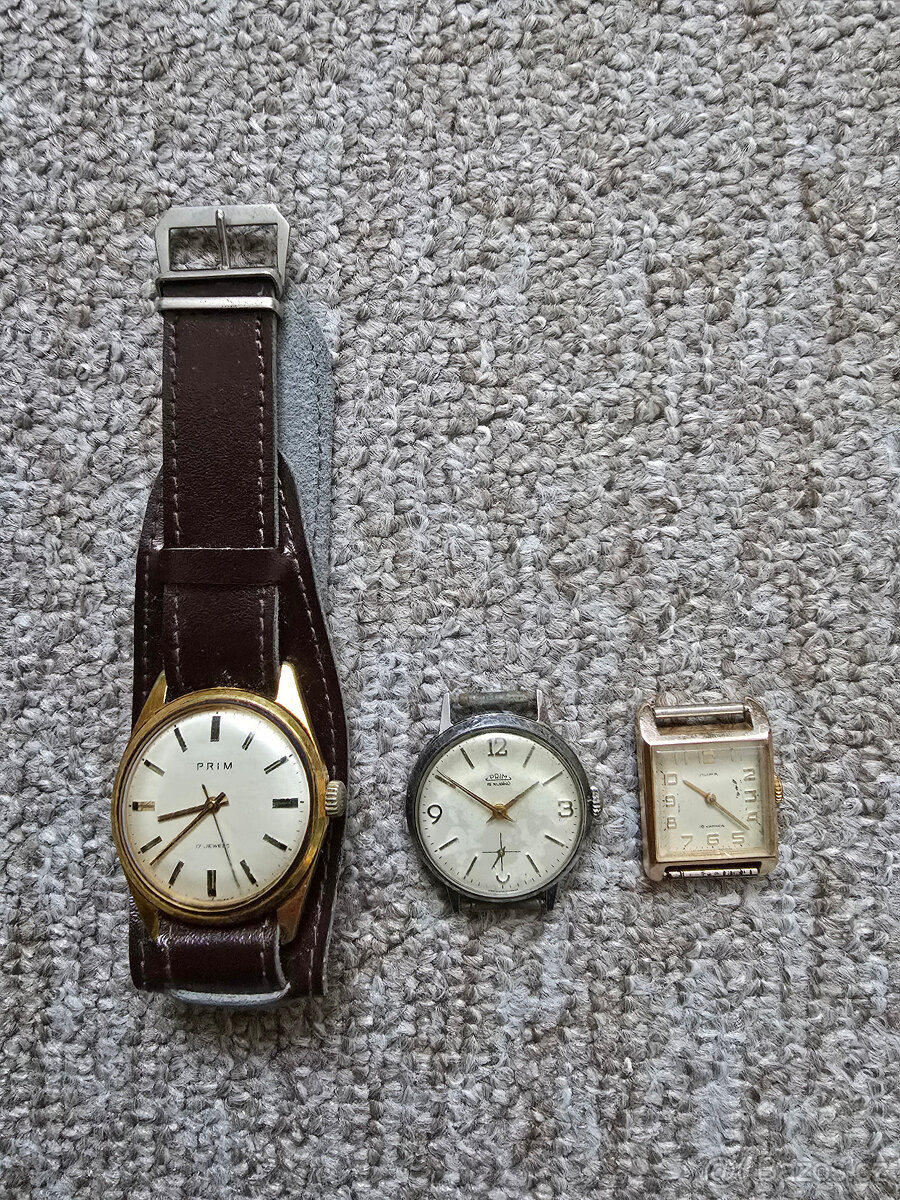 Cena: V textu. Prodám Prim hodinky vše funkční. Možno vidět v Železném Brodě. 1. Prim s řemínkem 1900 Kč 2. Prim bez řemínku 900 Kč 3. Nějaké ruské 200 Kč