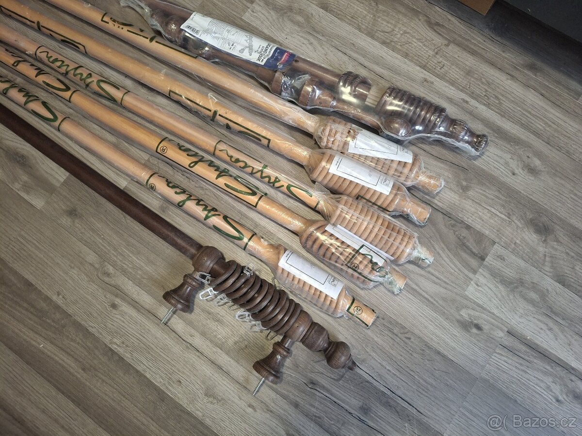 Prodám dřevěné tyče na záclony + koncovky + úchyty + kroužky. Až na jednu jsou nepoužité. garnýže kompletní: 1 x 160 cm 2 x 140 cm 2 x 120 cm 1 x 140 cm, hnědá - PRODÁNO 1 x 100 cm, hnědá, použitá - PRODÁNO kus za 200,- 1 x sada úchyty, koncovky, kroužky za 100,- 2x sada koncovky 50,-/pár Nebo vše za 800,-