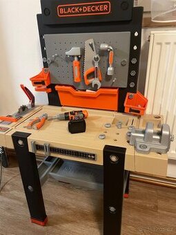 Nabízím dětskou dílnu, pěkná, mechanická pila, zvuky na baterie, rozměry 79x39x103 cm, pracovní nástroje - kladivo, šroubovák, kleště, klíče a pila, mechanická vrtačka (točí se), šroubky. Kartičky na výrobu autíček již opotřebené jinak pěkné. Moznost odeslání do PPL vydejny za 119 Kc.