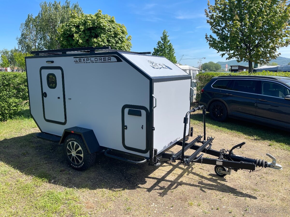 Explorer je pro dvě osoby a nebojí se ani horšího terénu. K tomu je vybaven terénními koly velikosti 14″. Má nízkou váhu – 560kg. Celková přípustná váha je tedy 750kg. Je energeticky soběstačný, na střeše má solární panel, který dobíjí vestavěnou baterii. Díky integrovanému držáku můžete sebou vzít dvě kola. - Délka obytného přívěsu: 4,35m - Šířka obytného přívěsu: 1,88m - Výška obytného přívěsu: 1,94m - Konstrukční rychlost: 100km/h Součástí je i výsuvná kuchyňka, která v sobě skrývá plynový hořák a miniledničku. Karavan má markýzu i předstan. Když je hezky, markýza plnohodnotně zastíní posezení, když je ale škaredě, je fajn mít trochu více prostoru... Karavan je vybaven integrovanou zástenou na sprchování a nebo "vykonání vlastní potřeby" . Pro tyto případy je k dispozici solární sprcha a chemické WC. Vnitřní prostor pro spánek má rozměry 1,95 x 1,4m. Prostým přeložením matrací ho upravíte pro sezení. Stěny jsou zatepleny 30mm tlustým XPS panelem, zateplena je i podlaha (to není u