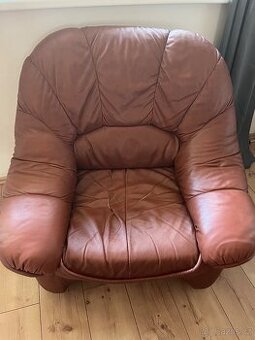 Prodám kožený gauč se dvěma křesly, gauč: šířka i s područkami 2 m, délka 72 cm, hloubka sedu 50, křeslo: šířka s područkami 102, délka 70, hloubka sedu 53. Kůže v místě sezení je potrhaná dle foto, pera v gaučích již utržené. Gauč je rozkládací.Pouze osobní odběr