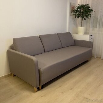Pohodlná rozkládací pohovka s úložným prostorem. Ideální do menšího bytu. Sezení pro 3 osoby, úzké područky. Šířka 209 cm, hloubka 92 cm, výška 85 cm. Spací plocha po rozložení 194 x 137 cm. Sedačka má praktický úložný prostor, zádové polštáře jsou na zip - potahy je možné je prát. Sedačka je ve skvělém stavu, z nekuřácké domácnosti bez domácích mazlíčků. K vidění a převzetí na Praze 4 (doprava je nutná vlastní).