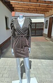 Materiál 55% polyester, 40% lurex, 5% elastan. Délka od ramen dolů 88cm obvodu v podpaží 92cm, rukávy od ramen - délka 63cm. V horní části ozdobné faldy s nafouknutou částí rukávů. Obvod přestřiženého pasu do gumy 64cm - lze roztáhnout do 88cm. Obvod dolního ukončení šatiček je 90cm. Šatičky jsou velmi elastické. Výstřih do V, poutka na pásek v délce 145cm. Barva odpovídá fotce č.2. Velmi sexy. Vzato 1x na maturitní ples, bez známek poškození či vad. Zasílám Balíkovnou za 65Kč, Zásilkovnou