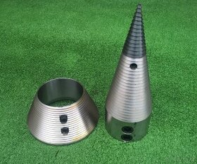 Štípací trn o průměru 150mm s vyměnitelnou špičkou zajištěnou pružným čepem. Délka kuželu 230mm. Otvor v kuželu na hřídel 28, 30, 32, 35mm. Možnost i většího kuželu s průměrem 170mm/délkou 280mm s dírou 35,38,40,42mm cena 4500,- nebo 45 a 50mm za 4600,-. Díra je bez pero-drážky, zajištění na hřídeli pomocí dvou silných imbusů.