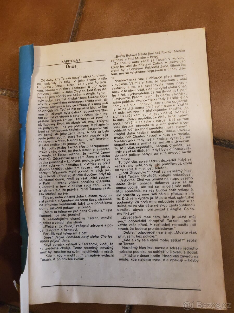 Sešity s příběhy o Tarzanovi od Edgara Rice Burroughse Sešit Tarzan a vězeň pralesa, ilustrace Zdeněk Burian, 1990 Sešit Tarzanovy šelmy, ilustrace Zdeněk Burian,1990, bohužel chybí přední strana sešitu Sešit Tarzan a Poklad Oparu, ilustrace Jiří Wowk, 1991 Cena za vše.