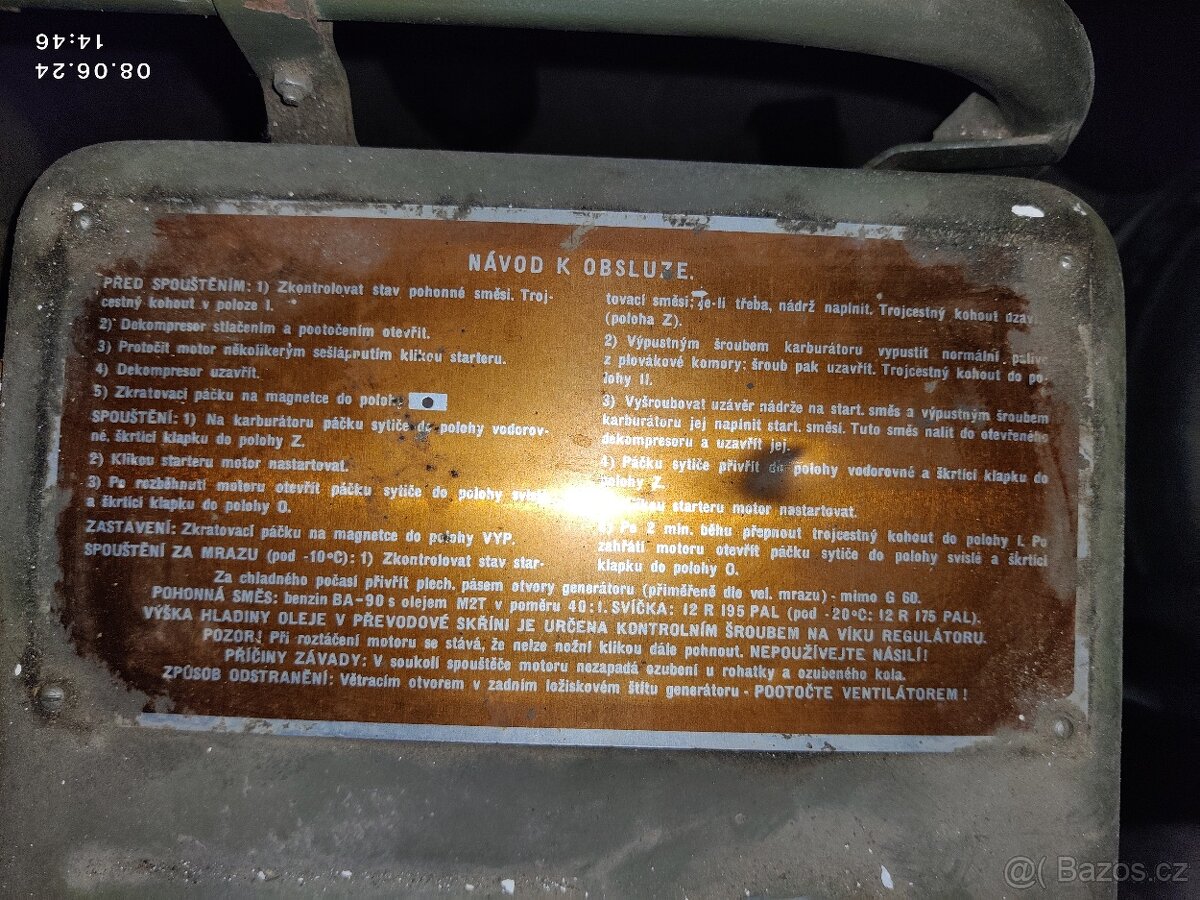 Nabízím vojenskou elektrocentrálu z roku 1986,ZB5AGb 2.2kw. byla krátce v provozu před 8 léty, od té doby jen jednou za čas dával jsem trochu oleje přez otvor na svíčku a protáčel. Dohoda.Psát jen sms nebo volat WhatsApp, Viber, Telegram na 602882253