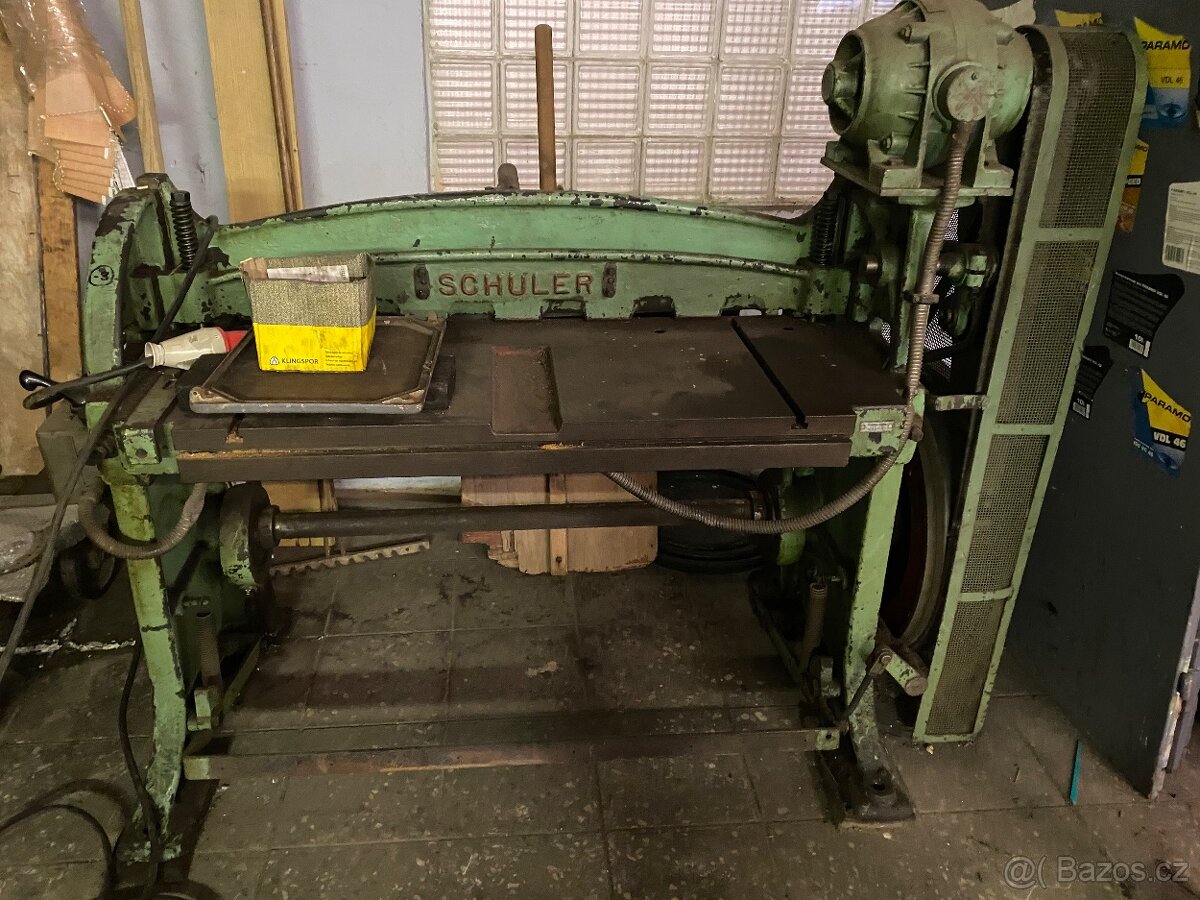 Tabulové nůžky na plech SCHULER – nepoužívané Prodám průmyslové tabulové nůžky na plech SCHULER, robustní mechanické provedení, vhodné do dílny nebo menší výroby. Stav: • nepoužívané • dlouhodobě odstavené • kompletní, bez viditelného poškození • doporučena kontrola / oživení před uvedením do provozu Specifikace: • výrobce: SCHULER • max. tloušťka střihu: • ocel cca 1,0 mm • železo cca 1,5 mm • mechanické provedení (setrvačník / řemen