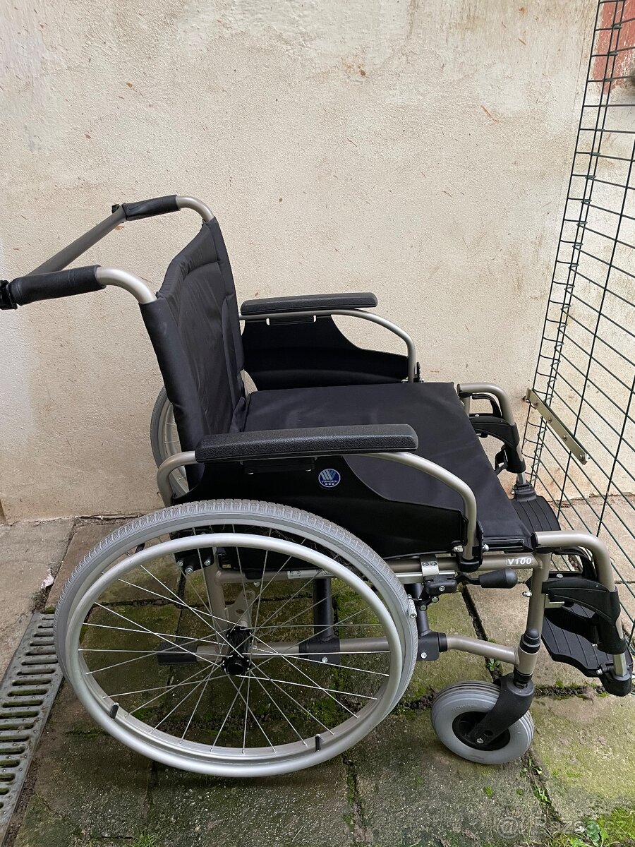 Mechanicky invalidní vozík s nosností až 170 kg. Šířka sedu 60cm. Použitý pouze párkrát, jako nový.