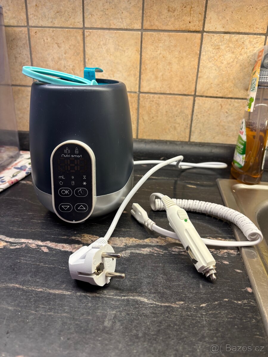 Plně funkční, použitý jen párkrát. Popis: Ohřívač lahví BABYMOOV Nutri Smart snadno a rychle ohřeje umělé i mateřské mléko v lahvi i v sáčku nebo skleničku s příkrmem, a to pomocí horké páry nebo vodní lázně. Režim vodní lázně umožňuje rozmrazit nádobu s jídlem nebo šetrně ohřát mateřské mléko na maximální teplotu 65° C, což zajistí zachování všech nutričních vlastností mléka. Režim parního ohřevu pak lze použít k super rychlému ohřátí kojeneckých lahví a příkrmů v čase 80 sekund. Ovládání ohřívače je velmi jednoduché a intuitivní, stačí nastavit množství tekutiny a výchozí teplotu před ohřevem a ohřívač Nutri Smart automaticky upraví dobu ohřevu tak, aby byla dosažena ideální teplota pokrmu na úrovni 37° C. Ohřívač rovněž umožňuje nastavit odložení začátku ohřevu o 15 minut až 12 hodin, čímž si můžete přípravu usnadnit a načasovat. Funkce udržování teploty pak zajistí zachování obsahu při ideální teplotě 37° C po dobu jedné hodiny. Součástí balení je adaptér do cigaretového zapalovač