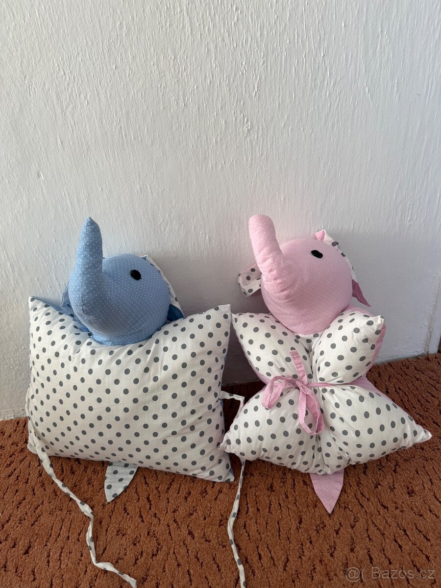 Prodám nepoužité polštářky ve tvaru slona pro chlapečka a holčičku. Dají se svázat tkaničkou. Cena za oba. Osobní odběr nebo zasláni poštou.