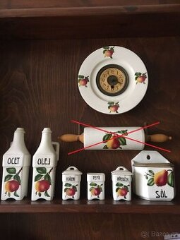 Cena: Dohodou. Prodám tuto soupravu (kořenky) s motivem jablko a hruška J. M. PORCELANIT. Manufaktura Josefa Mayera působící v Klenčí pod Čerchovem - přelom 19./20. století. Mírné oťuky vzhledem ke stáří. Hodiny mají původní strojek, po natažení jdou ale rychle. Rozprodám i jednotlivě. Inzerát aktuální do smazání. Možnost zaslání