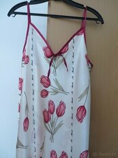 Prodám krasnou saténovou košilku Vel. 38- 40, ramínka jsou posuvná. Rozměry: celková délka 91 cm. měřeno , bez ramínek, šířka pod průramky 40 cm. Nošena 1 krát.