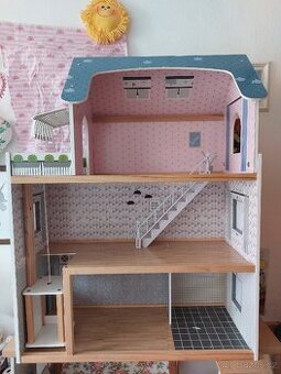 Prodám domeček na hraní s výtahem. Zachovalý. Včetně 8 figurek a vybavení (ložnice, obývák, kuchyně, koupelna), 3 stropní svítidla, 1 vchodový zvonek (na baterky). V koupelně opravený kousek podlahy (viz foto).