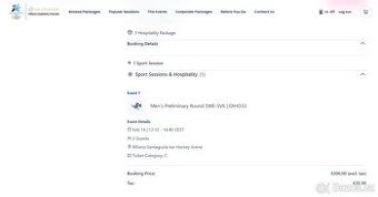 Hokej SWE-SVK | OIHO33 Prodám 2 místa vedle sebe, OIHO33 - Ice Hockey - Cat C - Winter Essentials - je to ""hospitality balíček"" s přednostním vstupem a občerstvením v rámci akce. Převod přes ZOH oficiální aplikaci. Možno potkat se osobně v Praze, Ml.Boleslavi (do 12.2.) nebo v Miláně, budu tam od 13.2.2026. Cena původní EUR 330 za oba.
