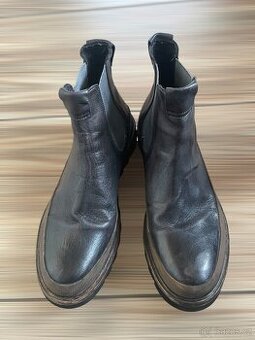 Pánské kožené boty ve velmi pěkném stavu, nejsou zateplené, na bokách guma pro snažší obouvání, jen drobné známky nošení- nejsou moc nošené, délka stélky cca 28cm, výška boty18 cm, barva je tmavě šedá s jakoby patinou