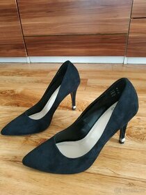Prodám černé semišové lodičky vel. 38, výška podpatku 10 cm. Na podpatku kamínky. Nové, nenošené. Cena bez poštovného, ideálně osobní odběr Praha 5 Smíchov.