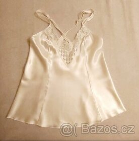 Krásná košilka v barvě šampaň pod sako nebo jako luxusní spodní prádlo či na spaní. V detailu jsou drobné štrasové kamínky.