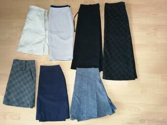 Dívčí (dámské) sukně vel. 158-164 / vel. XS – S Světlá krémová sukně vel. S Pas možno stáhnout páskem, áčkový střih, zapínání na zip + knoflík, 2 kapsy Pas max 36 cm, délka 44,5 cm V pořádku, Kč 50,- Pruhovaná sukně (modro-bílá) zn. Esprit, vel. S Pružný materiál, vzadu zapínání na zip a malý rozparek Pružný pas – v klidu 35 cm, délka 52,5 cm V pořádku, Kč 40,- Černá sukně s jemnými proužky zn. C&,A vel. 36 Elastický lehkýk materiál, všitá tkanička v pase Elastický pas na gumu– v klidu 36 cm, délka 64 cm V pořádku, Kč 40,- Černá sukně s jemnými proužky ve tvaru čtverečků zn. Promod Áčkový střih, zapínání na zip po straně Pas max 36 cm, délka 73 cm V pořádku, Kč 40,- Šedá sukně zn. Orsay, vel. S 2 kapsy, vzadu zip, s podšívkou Pas max 37 cm, délka 40 cm V pořádku, Kč 70,- Tmavě modrá sukně Vzadu zip, s podšívkou, áčkový střih Pas max 34 cm, délka 47 cm V pořádku, Kč 70,- Sukně z lehké džínoviny zn. Oasis, vel. uvedna 38, ale spíše 36 Zavinovací, áčkový střih, skládaná sukně Na bo