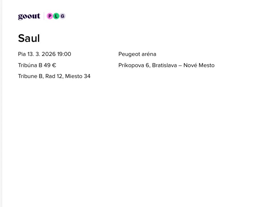 Prodám lístek na koncert Saula v Bratislavě, v Peugeot aréně. Koncert se koná 13.3. 2026 v pátek. Bylo to zakoupeno jako dárek, ale bohužel do toho skočila rodinná dovolená. Je to oficiálně z GoOut a prodávám ho v kupní ceně. Možnost slevy.