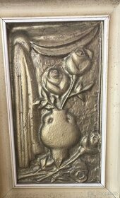 Cena: Nabídněte. Nabízím 2 obrazy - plastika motiv: květiny ve váze rozměry s rámem: 45 x 71 cm (světlejší obraz) 54 x 107 cm (tmavší obraz)