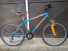 Nabízím horské kolo pro děti od cca 8 do 11 let, velikost kol 24". Kolo je nově kompletně seřízeno, promazáno, vše funguje perfektně. Dáno nové sedlo a obě duše. Otočné řazení 3 x 6 převodů (Grip Shift), odpružená vidlice, V-brzdy.
