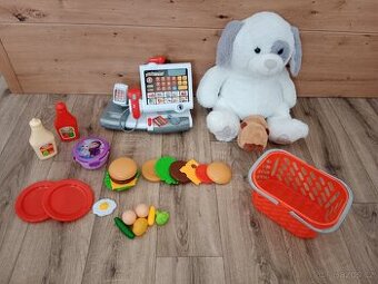 Dětská pokladna Klein s příslušenstvím+plyšové hračky. Vše za 400 korun Balík obsahuje - Nyní se váš malý může stát pravým prodavačem v supermarketu. - Pokladna Klein je vybavena pravým kalkulátorem s LCD displejem a pod klávesnicí se nacházejí tlačítka usnadňující práci prodavače - Pokladna Klein je vybavena skenerem čárových kódů, váhou a čtečkou platebních karet - Pomocí tlačítka je možné otevřít zásuvku na peníze - Pokladna Klein určitě přinese spoustu skvělé zábavy - Nový nádherný plyšový pejsek. Velikost 50 cm - Nový plyšový náramek na ruku Kapibara