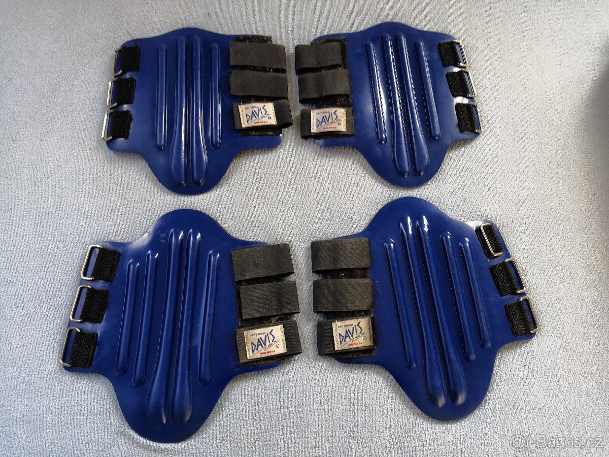 Prodám modrou sadu předních a zadních chráničů nohou zn. Davis + zvony s výliskem proti otáčení. Super na údržbu, nenasákavý materiál vel. M/L super stav
