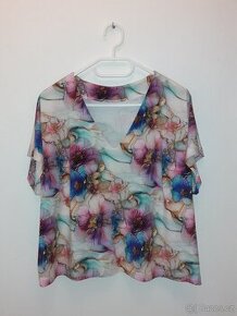Nová halenka z měkce poddajného úpletu s digitálním tiskem. Spadlé rukávy, véčkový výstřih. Halenka má volný střih a bude slušet i plnějším postavám. Horní obvod halenky 116 cm. Zadní délka 53 cm. Materiál 95% viskóza, 5% elastan. Velikost 44. Osobní odběr Letovice, Březová nad Svitavou