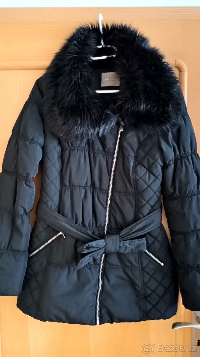 Bunda černá značka Orsay, velikost 36. Šířka pod průramky 2x48cm, celková délka 76 cm, délka rukávu od ramene 65 cm. Kožešinový límec, asymetrický zip. Materiál 100% polyester. Asi 10cm podšívky ručně zašito, jinak velmi dobrý stav.