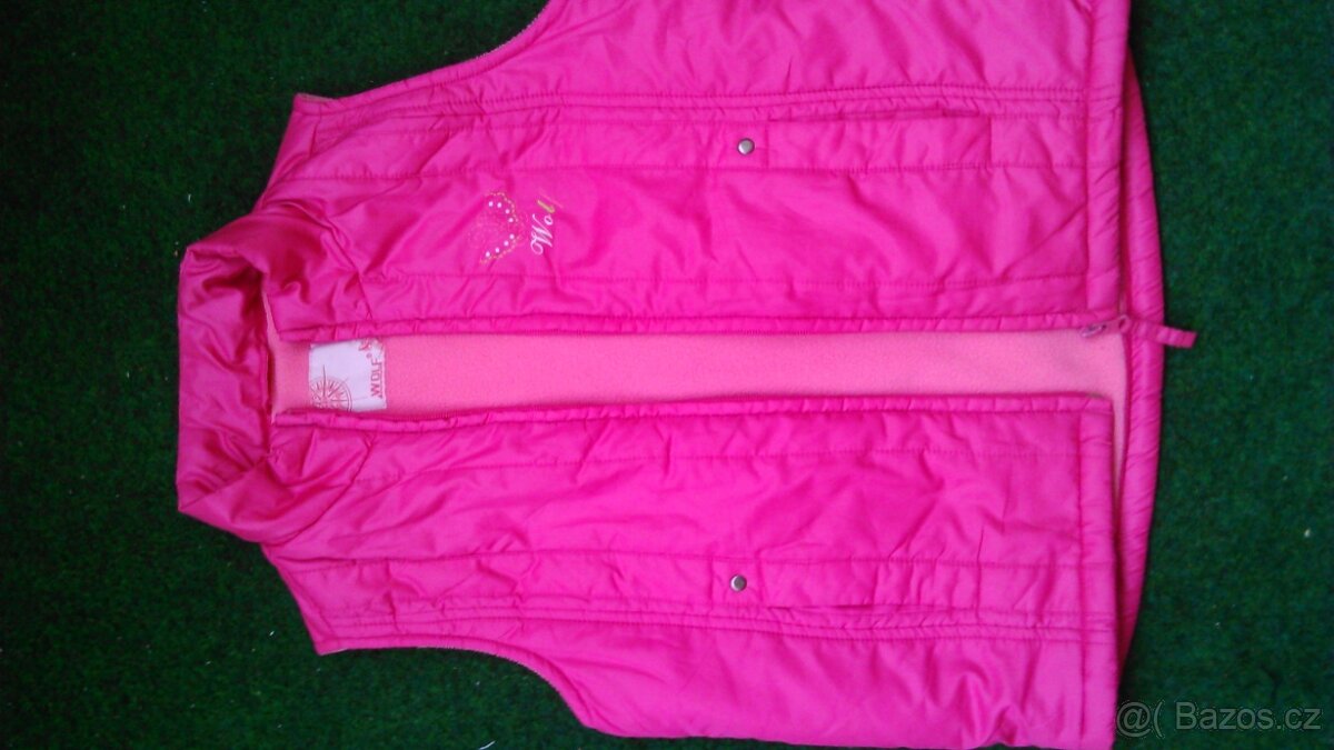 Růžová vesta vel. 116 s podšívkou. Délka 47 cm, šířka 42 cm.