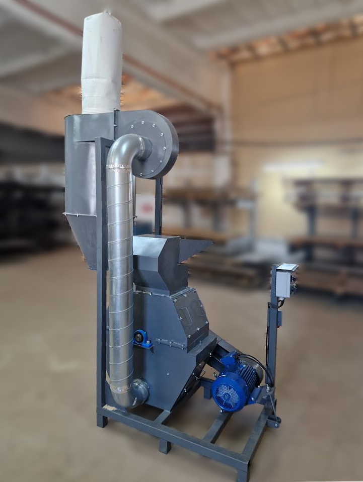 Drtič dřevního odpadu slouží k drcení dřevěných zbytků z výroby, papírových odpadů, např. papírové trubky, karton, lepenku, krátké větve,.. Drtič (štěpkovač - šrotovník – kladívkový mlýn) mele také obilí, slámu, dřevní štěpku, vojtěšku a podobné suroviny pro výrobu pelet. Drtič má rotor s noži z HARDOXU a je osazen obvodovým sítem, jehož otvory propouští jen odpad stejné velikosti. Suchý podrcený odpad lze využít jako palivo nebo surovinu pro další zpracování - briketování nebo pro výrobu dřevěných briket a pelet. Odstředivé síly působící na drť během drcení ženou zrna proti sítu. Velikosti otvorů v sítu určují, jak hrubozrnná bude vaše pomletá surovina. V našem drtiči je síto s otvory o průměru 5 mm. Můžeme dodat také síta s jinými průměry otvorů 4, 5, 6, 8 mm a taky čtvercové otvory, které jsou vhodné pro vysoký výkon u štěpky pro kotelny a zahradnictví. Hotovou drť odsává horní ventilátor do cyklonu. Z cyklonu pomletá drť – štěpka – šrot, .. padají do zásobníku. Drtič lze přistavit