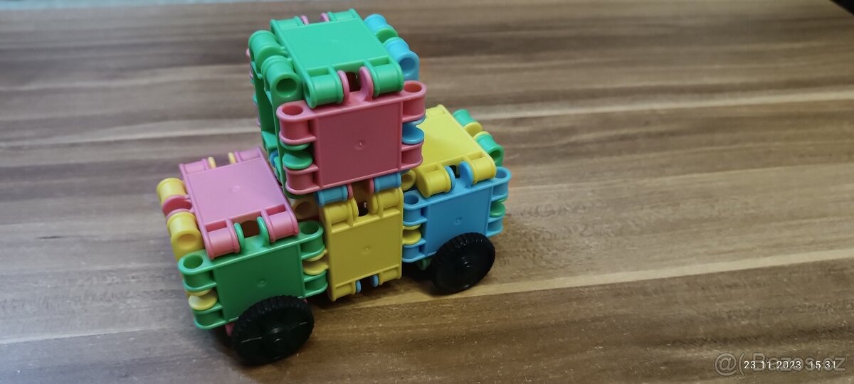Stavebnice s plastovými čtvercovými dílky a koly. Možné sestavit autíčko - viz foto, nebo i jiné dle fantazie. Dílky do sebe zapadnou pomocí výstupků, vhodné ve spolupráci s rodiči, nejde to zrovna lehce. Málo hrané, velmi dobrý stav, v neoriginální krabici bude dodáno. Cena 80,- Kč, k předání Orlová-Lutyně/Ostrava-centrum nebo poštou/zásilkovnou.
