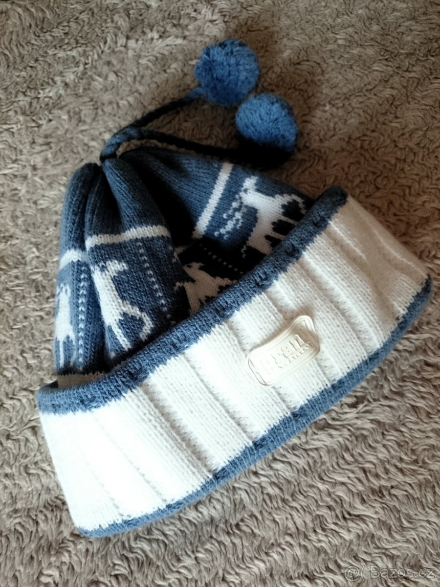 Prodám modrobílou čepici na zimu s motivem soba.