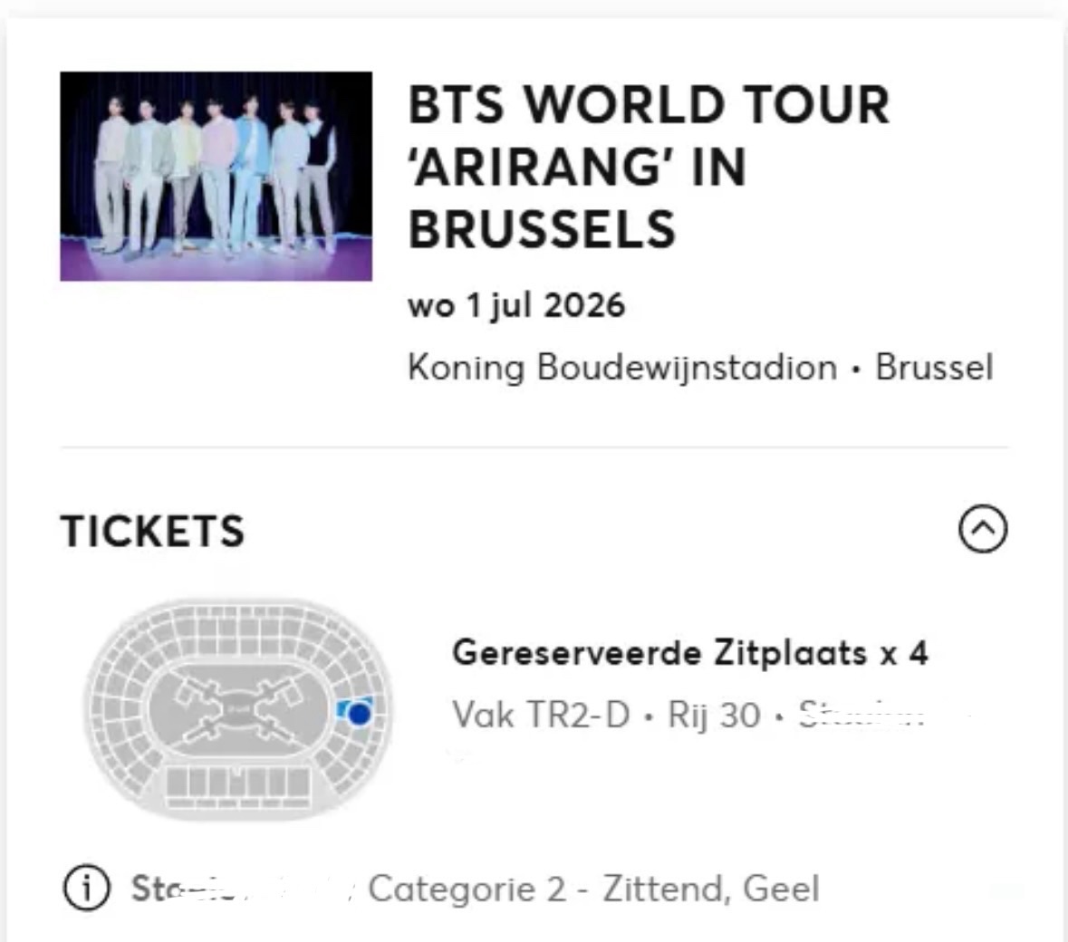 Dobry den, predam 4ks vedla seba na koncert BTS v Belgicku. Skvele miesta, s vybornym vyhladom. - osobne stretnutie - kupnopredajna zmluva - okamzity transfer na vas ticketmaster ucet - recenzie z predoslych predajov Dakujem.