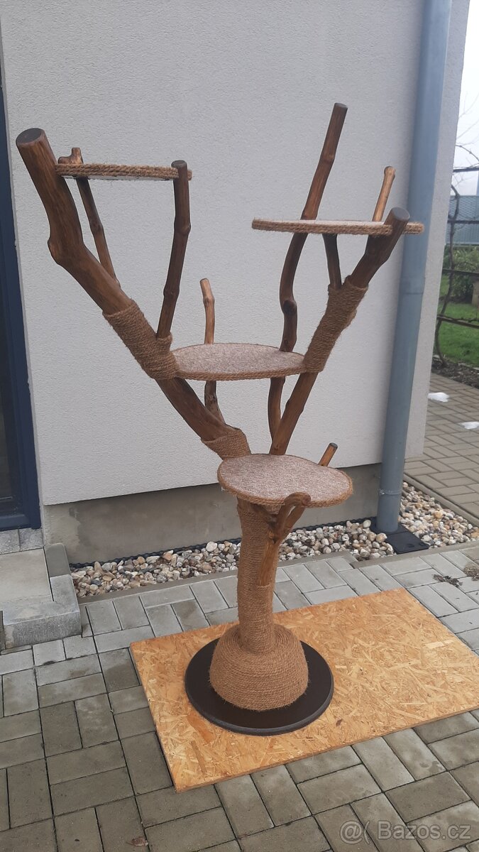 Nabizim novy nepouzity kocici strom o celkove vysce 165cm a maximalnimi pudorysnymi rozmery cca 90x70cm. Strom ze silneho kmene ma tezky zelezobetonovy podstavec, sedaky z mikrostepkovych desek polepenych zatezovym kobercem a lepenou omotavku prirodnim lanem. Drevo je dukladne obrouseno a osetreno lazurou s voskem. Vaha cca 25-30kg. K videni Milovice, okr.Nymburk.