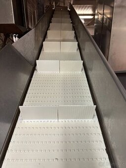 Prodám nerezový pásový dopravník. Délka 350 cm. Modulární pás s hradítky / lopatkami / příčkami šířka 30cm. Určený pro styk s potravinami. 3 fázový motor. Možnost vystavení faktury. Při rychlém jednání možná dohoda.