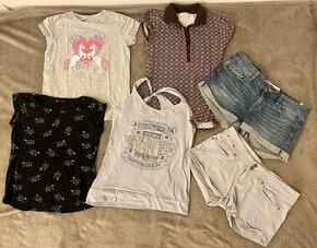 Tričko černé s dalmatýny Sinsay vel S , tričko šedé Unicorn Primark vel 152, tílko šedé Summerisland XXL, ale velikost je tak M, triko s hnědým límečkem Orsay pružné vel +-M, kraťasy šedé Terranova M, modré H&M vel 30