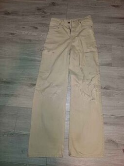 Zachovale kalhoty s dírami na kolenou. Kupované nové v obchodě a nošené dcerou. Vzadu na nohavicích je nošení znát.