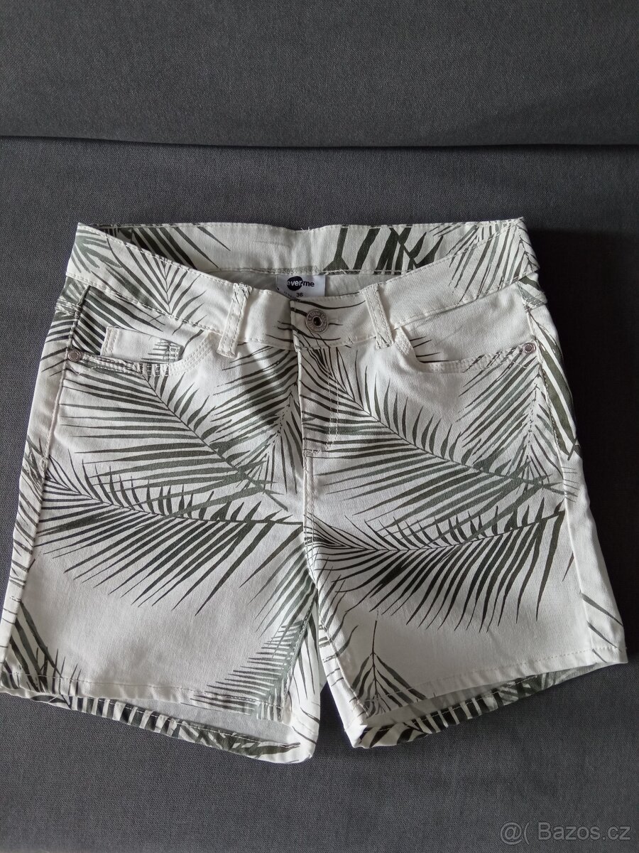 Prodám nikdy nenošené kraťasy zn.Everme, zakoupené v Takku. Vel.36, pas 36 cm (x2), délka 34 cm, od rozkroku 11 cm. Mají klasicky kapsy vpředu i vzadu. Barva je bílo-khaki. Složení: 64% bavlna, 34% PES, 2% elastan.