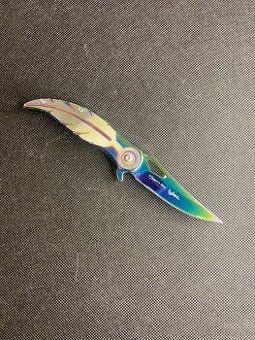 Prodám stylový zavírací nůž s duhovou (rainbow) povrchovou úpravou. Originální design rukojeti ve tvaru peří, celokovové provedení, pojistka proti zavření. Nůž je lehký, skladný a pohodlně se vejde do kapsy. Vhodný do sbírky, na běžné nošení nebo jako zajímavý dárek. Stav viz foto – velmi pěkný, plně funkční. Možnost osobního předání nebo zaslání po domluvě.