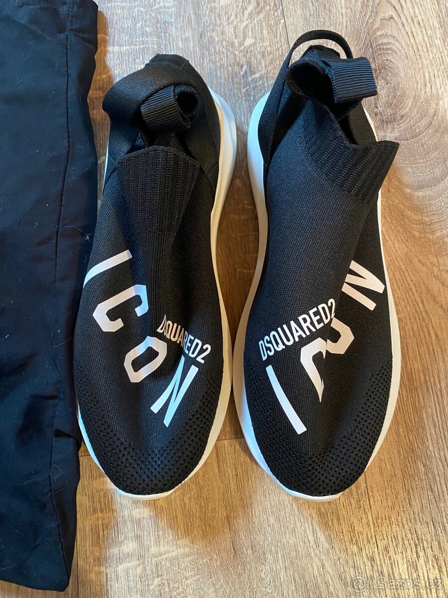 Cena: Dohodou. Jedná se o černé nazouvací tenisky Dsquared2 Icon s nápisem ICON a robustní gumovou podrážkou. Velikost 43
