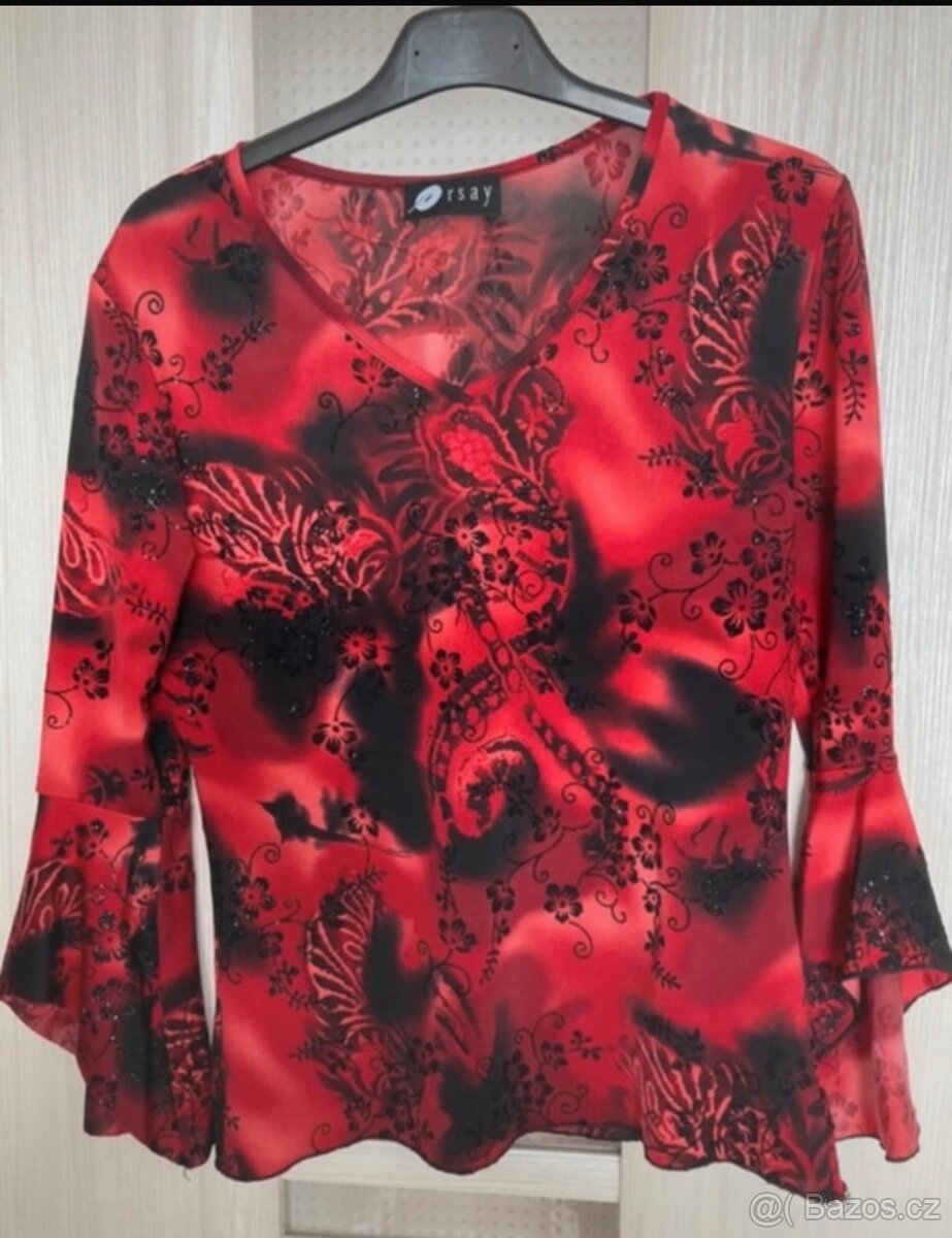 Halenka je moc pěkná. Psaná velikost L, ale sedí spíš na M. Délka 55, rukáv 54, prsa 42-50, je elastická. Barva červená, černá.
