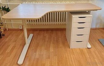Nabízím rohový pracovní stůl 160x120/60cm. Výšku lze nastavit v rozmezí cca 65-85 cm. Deska barvy bíle mořený dub. Nohy a konstrukce kovová bílá. Pod pracovní deskou je síť na kabely, aby volně nevisely. Dále nabízím šuplíky 36x58x70 cm (š/h/v). Vše z produkce IKEA. Cena samostatně stůl 3.500,- a šuplíky 1.000,- Cena společně 4.000,- Osobní odběr Brno. Na žádosti o zaslání nebudu reagovat.