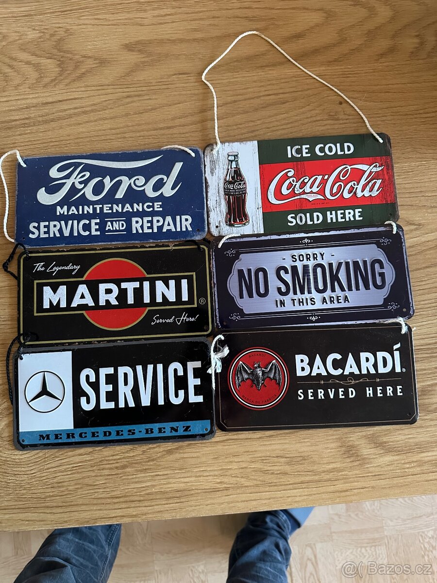Retro plechové cedule – set 6 ks (Ford, Coca-Cola, Mercedes, Bacardi, Martini, No Smoking) Použité, pěkný stav, jen drobný oděrky – viz foto. Ideální do garáže, baru, kanceláře nebo „man cave“. Rozměry: (š,v) 23x12cm, materiál: kov Prodávám pouze jako celek. Cena: 499.- Kč – pevná, nesmlouvám. Osobní předání Praha 15 - Horní Mecholupy nebo Zásilkovna při platbě predem..